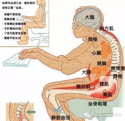 长时间坐着,肌肉燃烧脂肪更少,血液流动的更加缓慢,使脂肪酸更容易堵塞于心脏。长时间坐着已经有高血压、胆固醇提高有关,而且心血管疾病发生率会倍增。